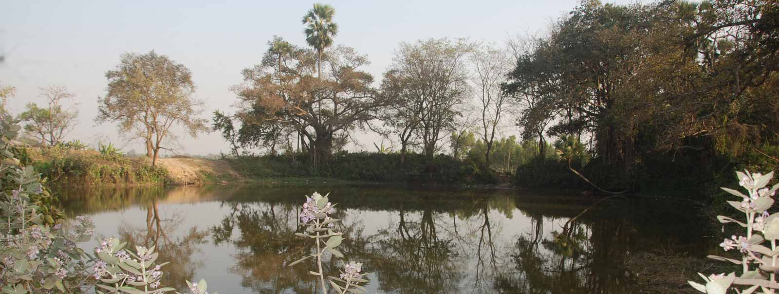 The Rivulet Amodar, which was regarded by the Holy Mother as the Ganga, has formed on the northern out-skirt of the village a sort of a triangular-shaped peninsula which looks exactly like the back of Tortoise.