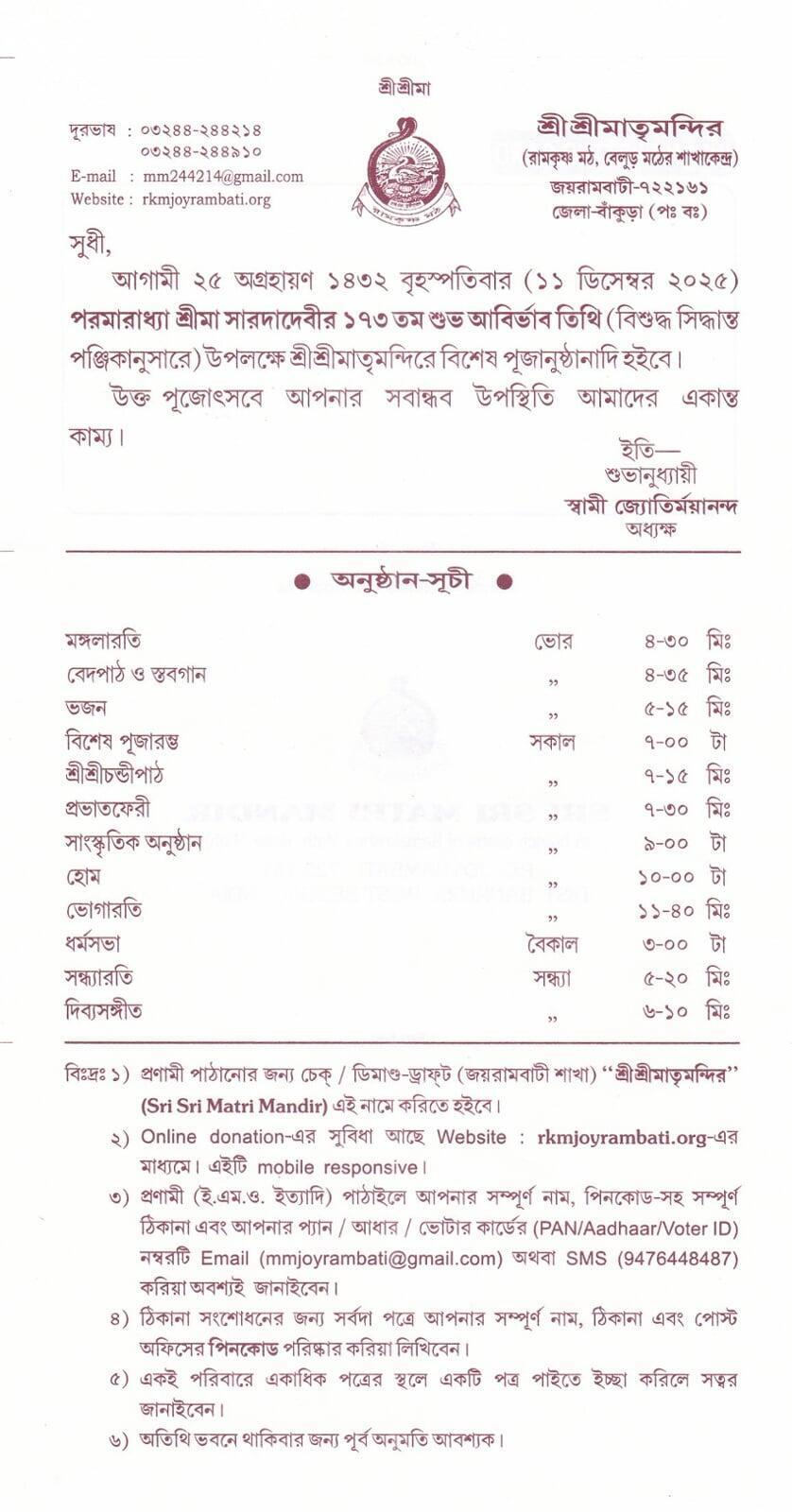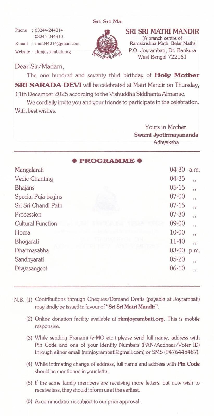HOLY MOTHER SRI SARADA DEVI'S BIRTHDAY